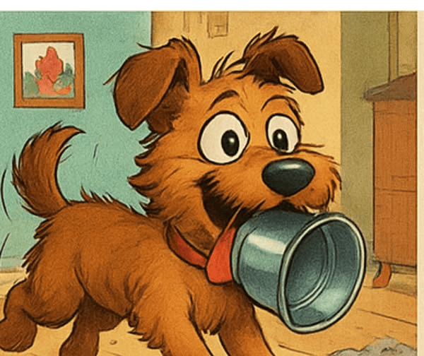 Esta mañana encontramos a Dino corriendo despavorido por toda la casa con el envase de su comida —uno pequeño, de metal, en la boca. Pensamos que estaba jugueteando como de costumbre cuando nos ve, pero, contrario a otras veces, no soltaba el envase metálico. Por fin lo agarramos e intentamos quitárselo, pero por más que tratamos, no pudimos.