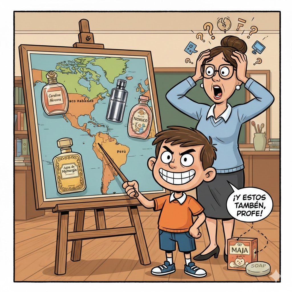 Y antes de que la maestra pudiera recuperar el habla, Pepito remató con elegancia: — “¡Ah! Y por supuesto, sin excluir los polvos y los jabones Maja, que esos nunca pierden la cobertura”.