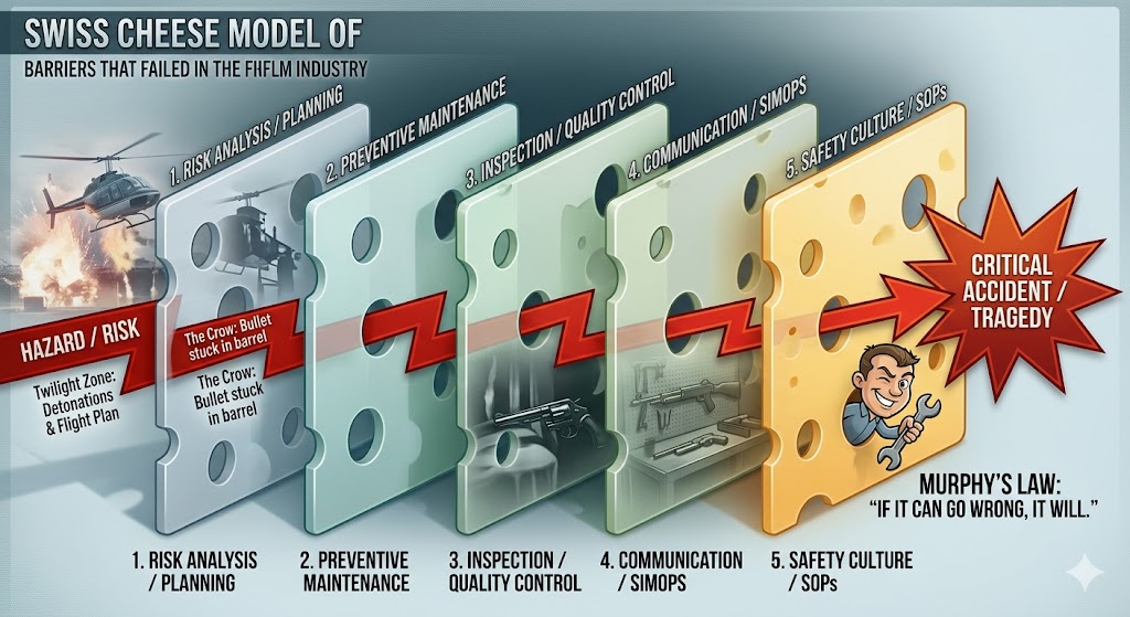- Análisis Técnico: Este caso resalta el concepto de la Cultura de Seguridad sobre el procedimiento. Se violaron protocolos fundamentales: la armera no estaba presente, el asistente de dirección entregó el arma y, crucialmente, una bala real llegó al set. Cuando la prisa por la producción prevalece sobre los procedimientos estándar de seguridad (SOPs), la complacencia se convierte en el peligro más crítico. La seguridad no puede ser un “opcional” dependiendo del presupuesto o el tiempo.