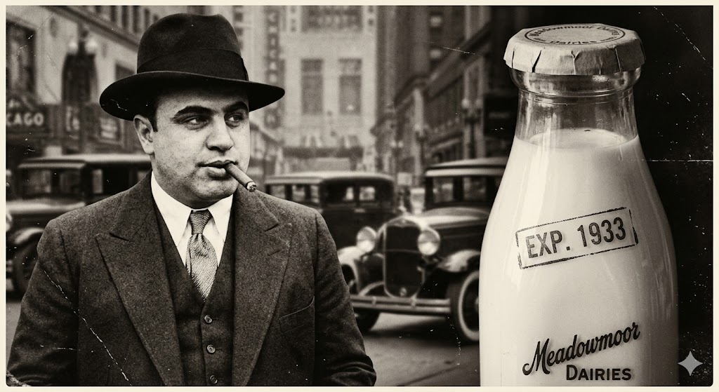 - El Movimiento Maestro: Capone controlaba Meadowmoor Dairies. Con su particular “estilo de persuasión”, presionó al ayuntamiento de Chicago para que fuera obligatorio marcar las botellas. ¿Protección al consumidor? No precisamente: era la jugada perfecta para asfixiar a los pequeños competidores que no tenían la maquinaria para imprimir fechas.