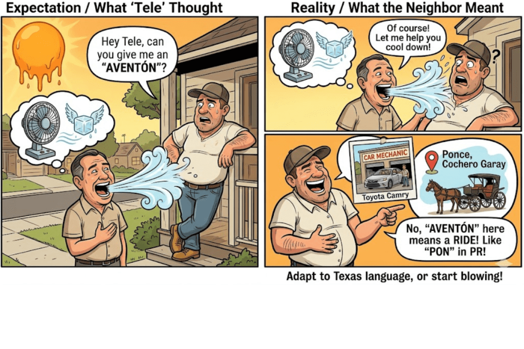 Hearing “coche,” my mind escaped for a second back to Ponce, remembering our beloved carriage-driver Garay… but reality quickly pulled me back to Texas. Dead with embarrassment, I apologized a thousand times and, finally, gave him the famous “aventón,” but in my Toyota Camry and not powered by my lungs.